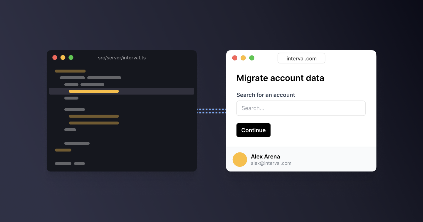 Interval gives developers the best of both worlds: simply wrap async functions in your app with the Interval SDK, and get interactive, multi-step forms in your browser, without writing any frontend code. This means that the experience of writing Interval actions is as easy as writing a CLI script - but the end result is a full web app with auth and audit logs, perfect for handing off to your team.