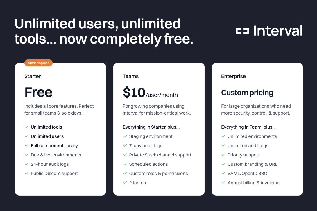 Our new pricing plans make it a no-brainer to start building with Interval, whether you're an indie dev, a small startup, or a team at a large enterprise.
