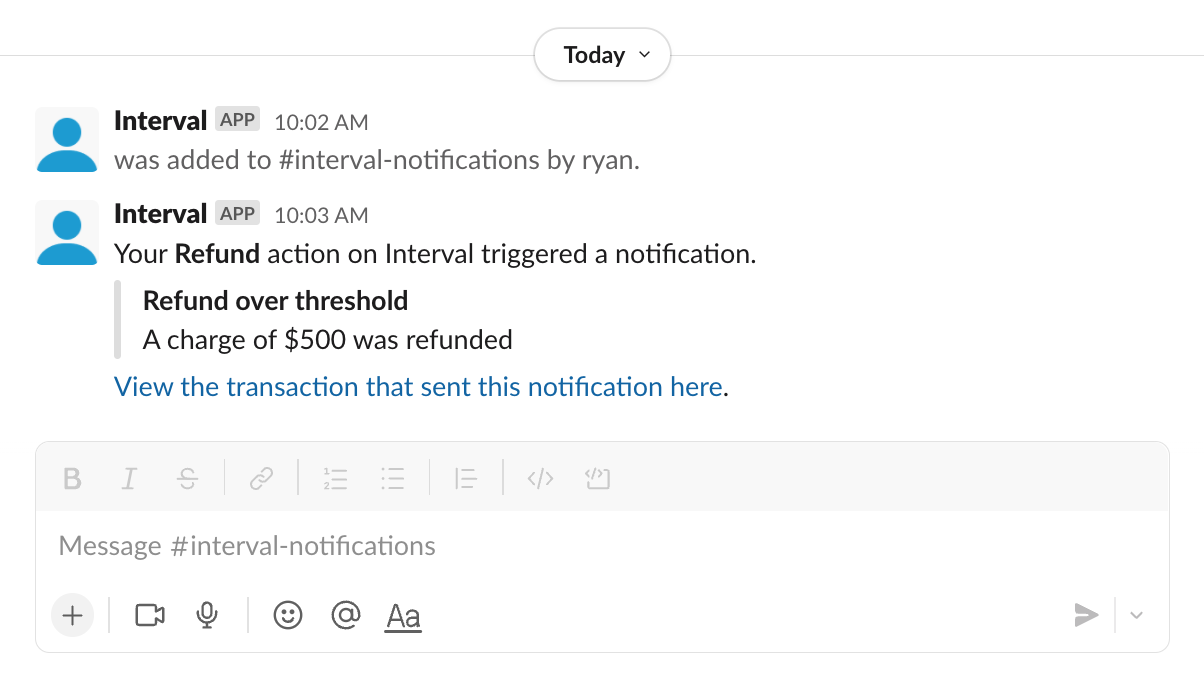 Sends a custom notification to Interval users via email or Slack. To send Slack notifications, you'll need to connect your Slack workspace to the Interval app in your organization settings.