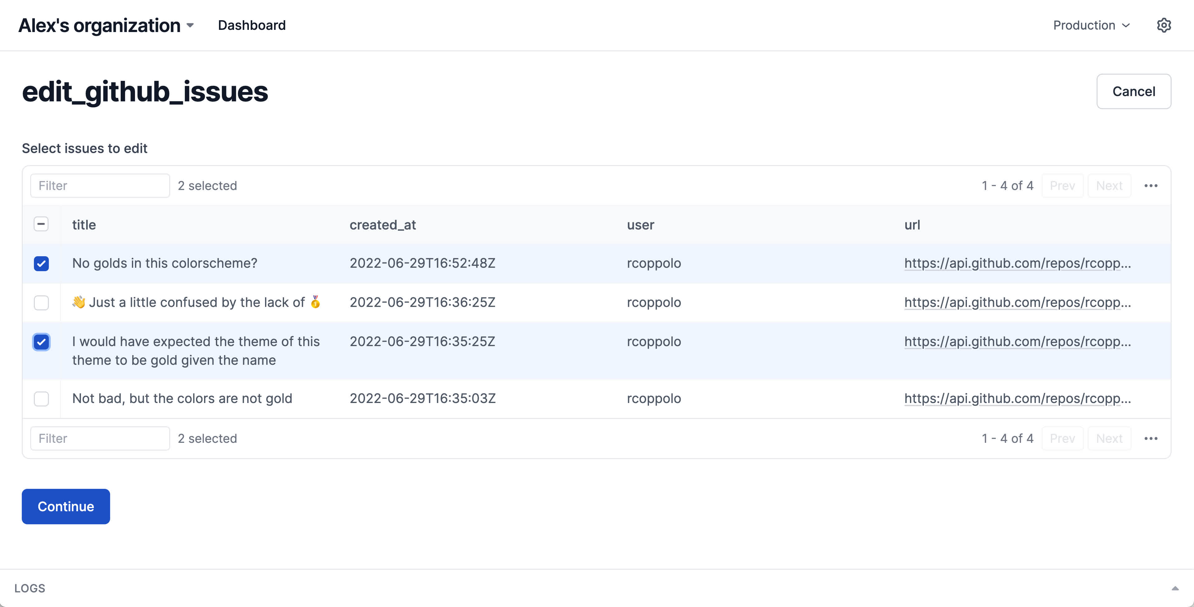const selectedIssues = await io.select.table("Select issues to edit", {