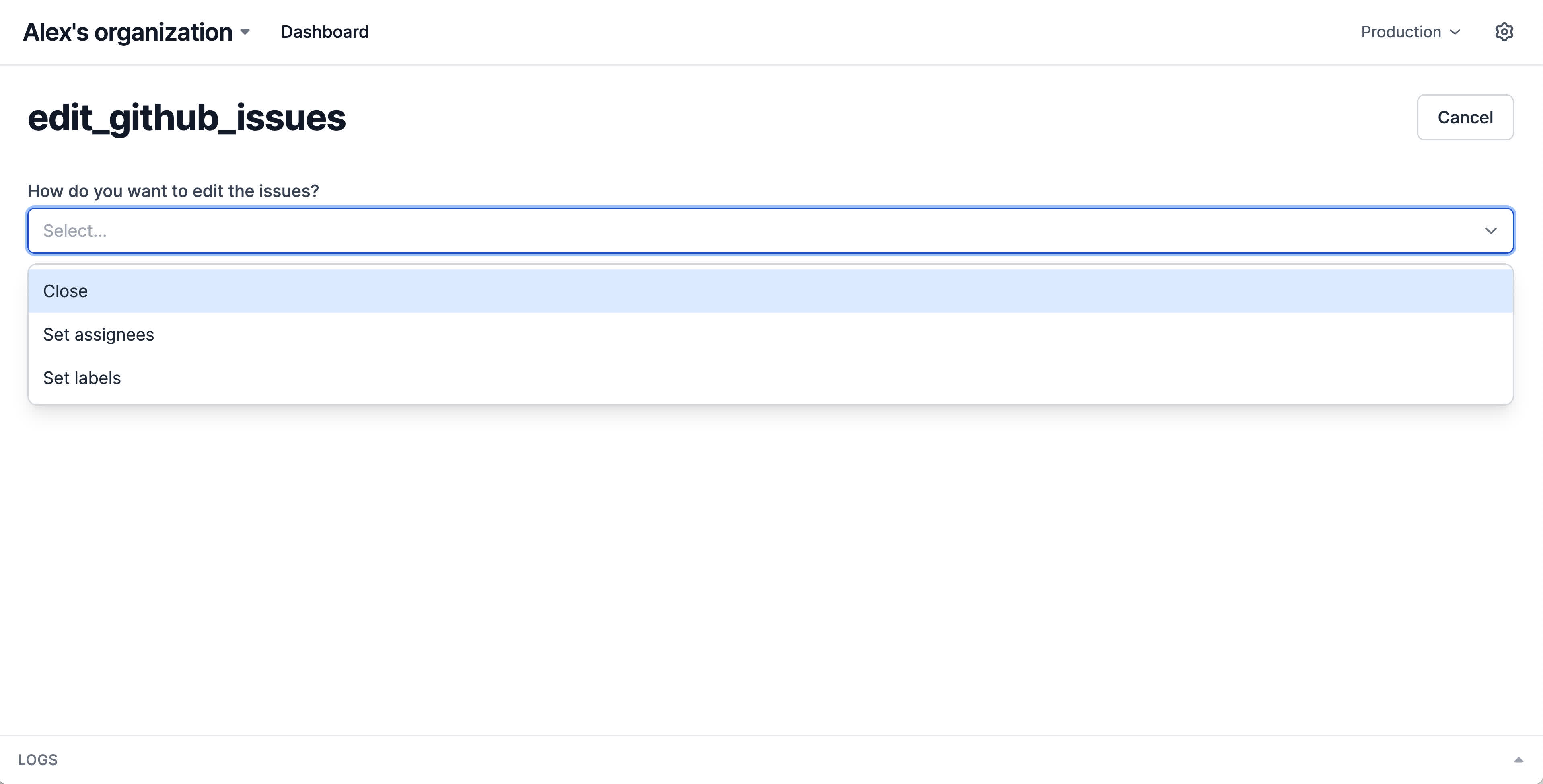 Once a set of issues are selected, we'll provide the user with a choice of how they want to edit them. For now we'll choose between closing the issues or adding labels.