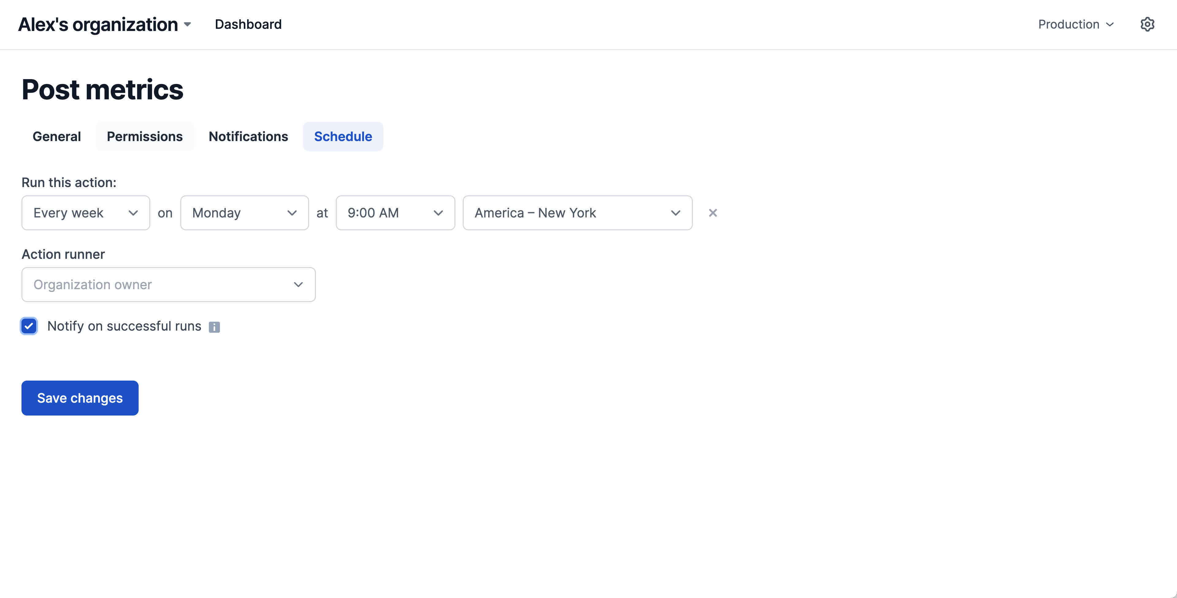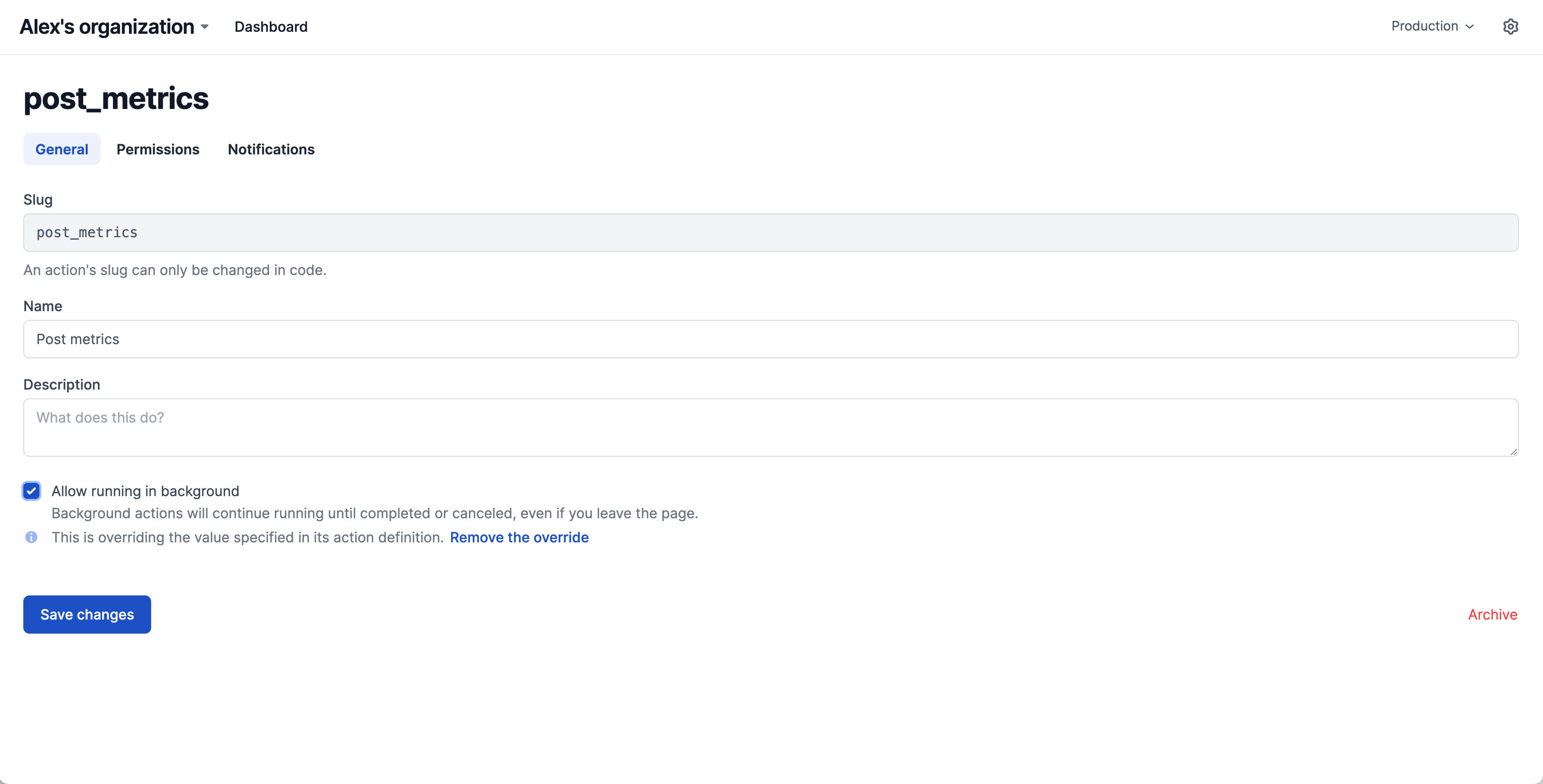 Next, we'll schedule the action to run automatically at a set time. To add a schedule, we first need to configure our action to run in the background. You can update this setting in the dashboard or you can configure the backgroundable property in your action definition code.