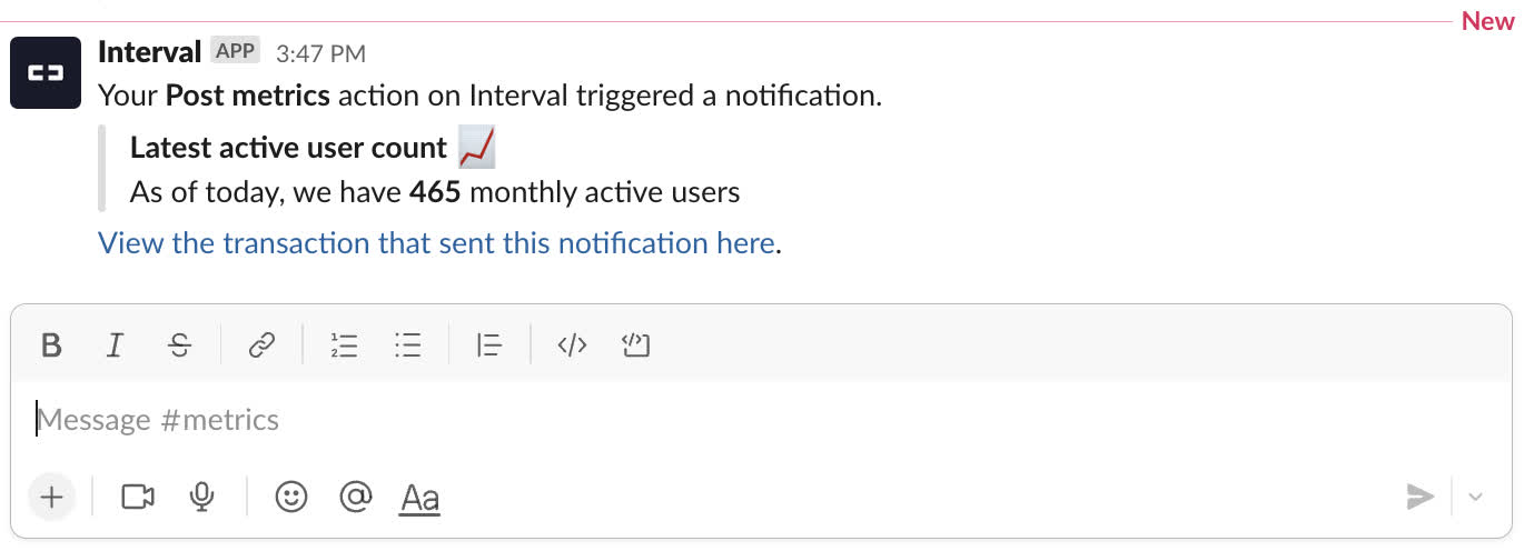 Now, each time the action runs, Interval will send off the results of your query to post to the specified Slack channel.