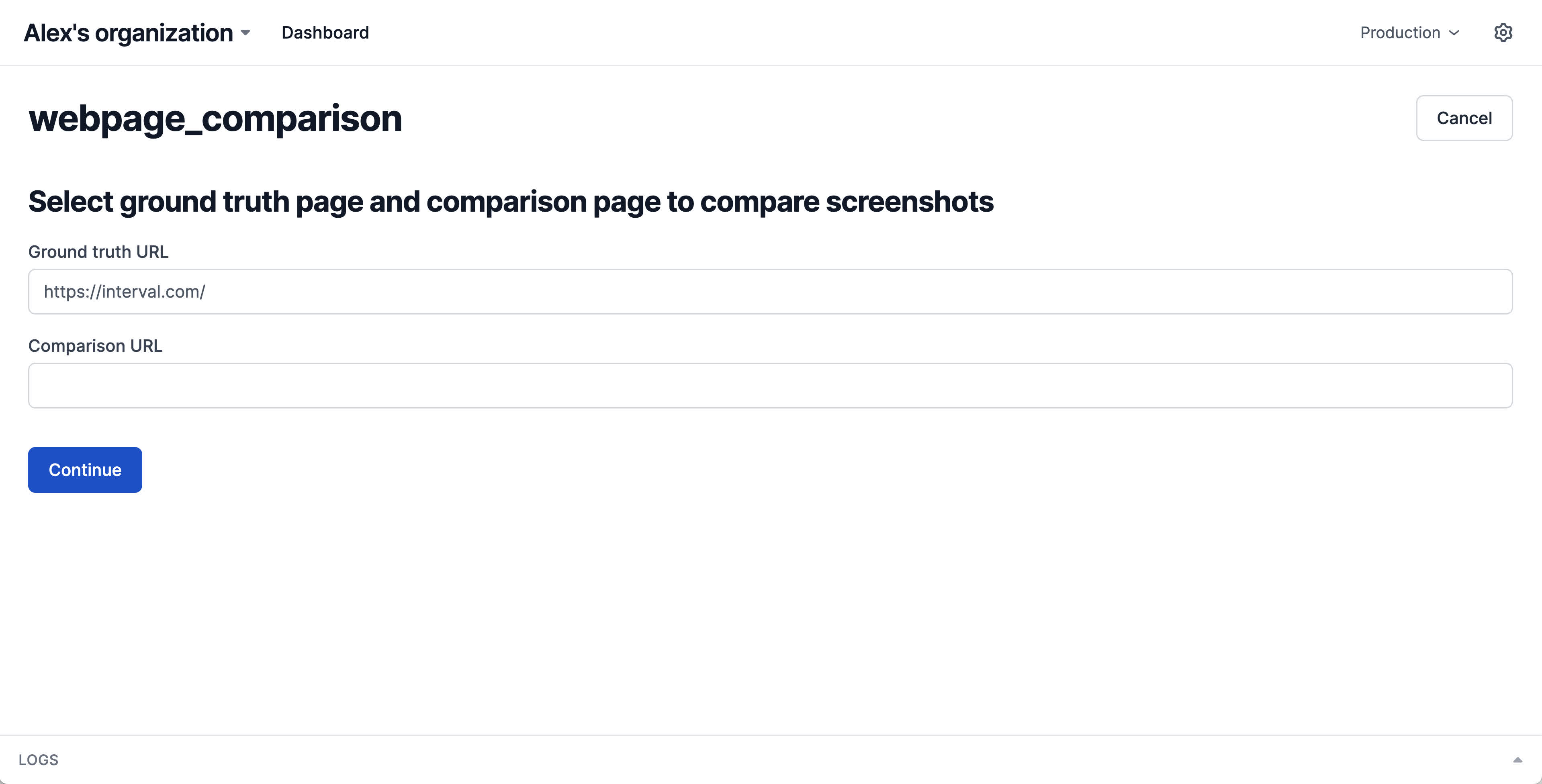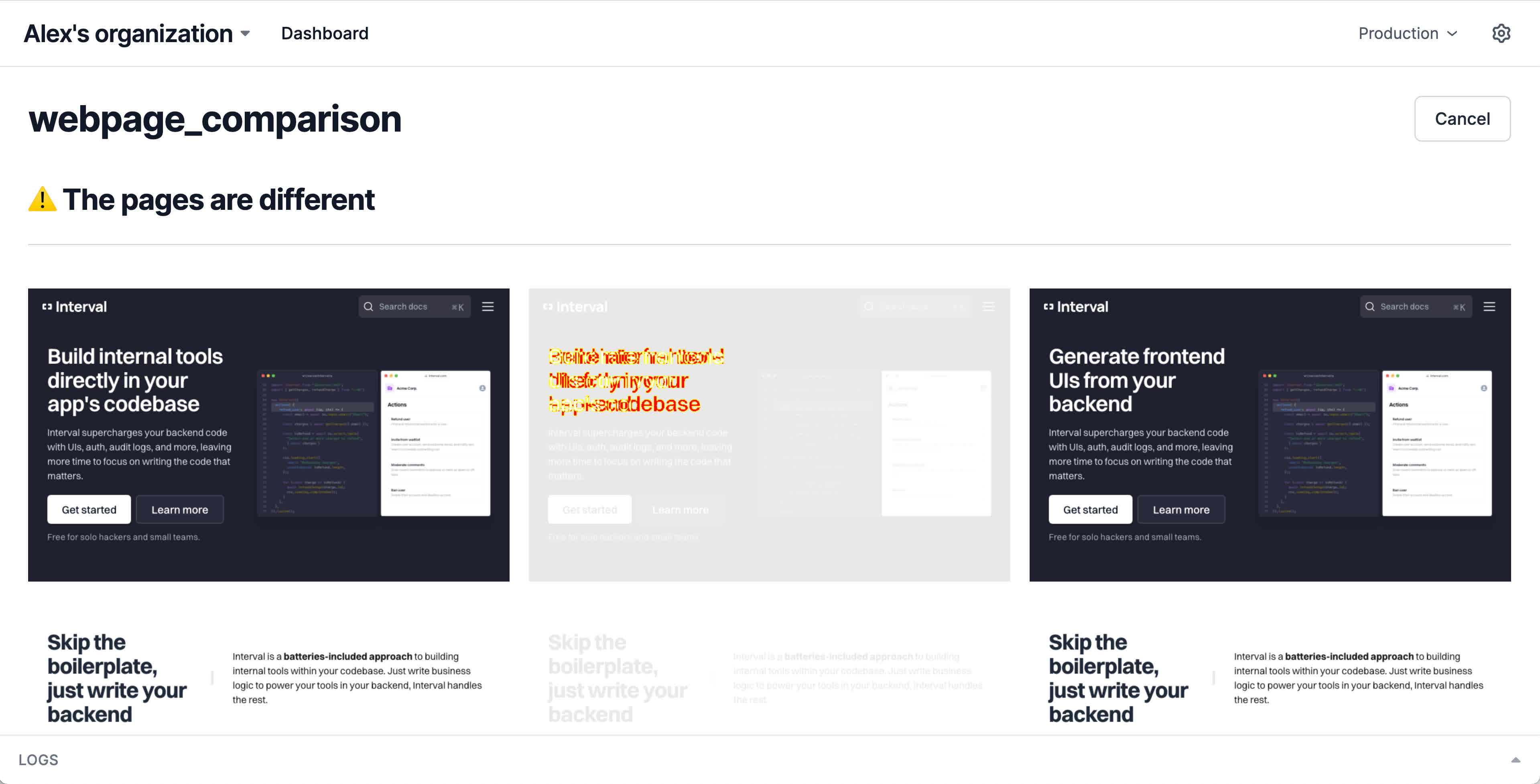 When deploying sites and apps on the web, you'll often want to test that code updates don't break or unexpectedly change existing designs. In this example, we use Interval to build a tool that takes snapshots of any two webpages (e.g. production vs staging), ensures they look exactly the same, and highlights any differences between them.