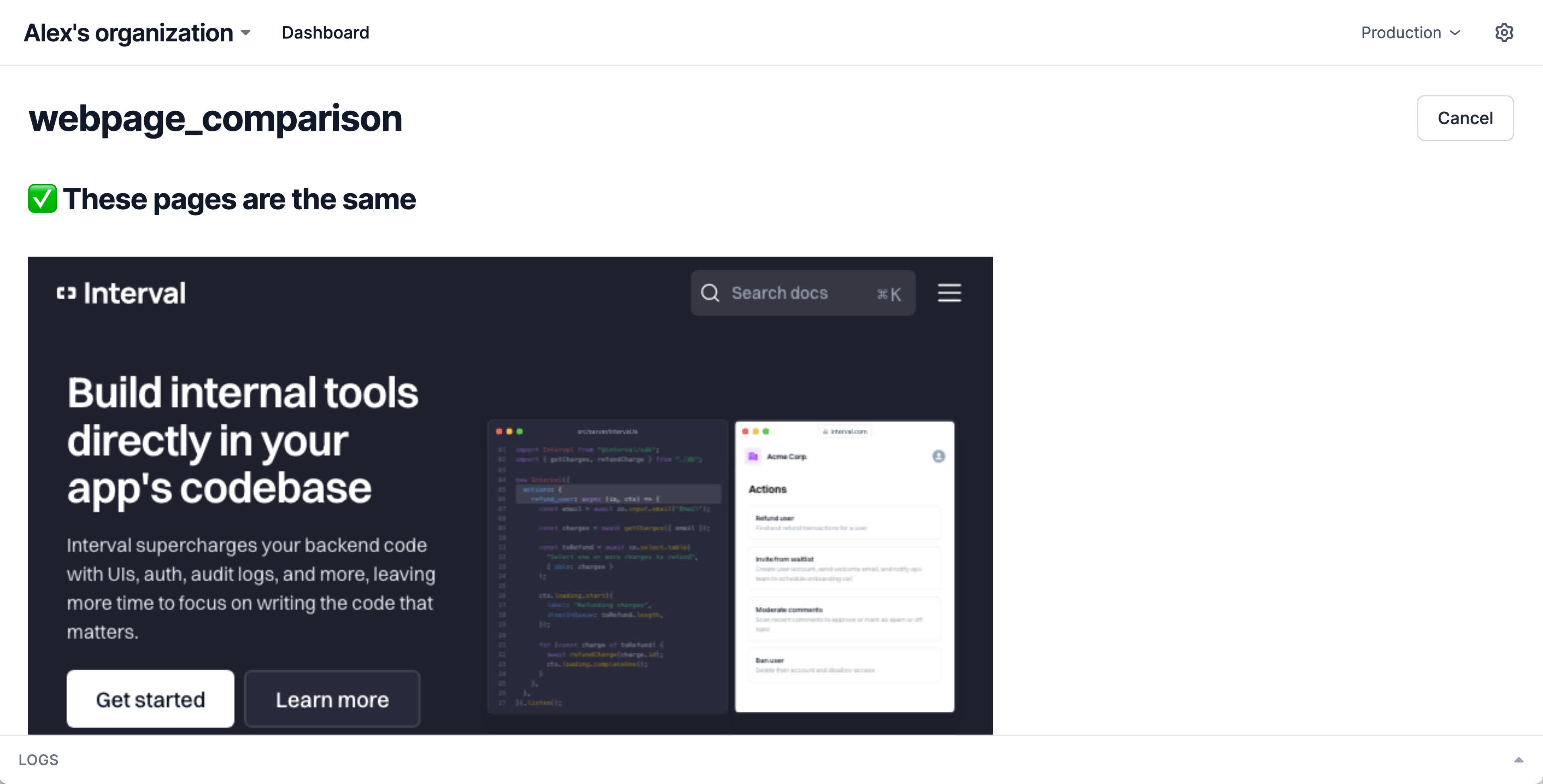 We'll wrap up the tool by returning the results to the user using io.display I/O methods. If the screenshots are identical, we'll return simply render the screenshot by leveraging Interval's io.display.markdown method, which can embed base64 images. If the screenshots are different, we'll render a table to allow viewing the screenshots side by side, with the newly generatated "diff" image in between.